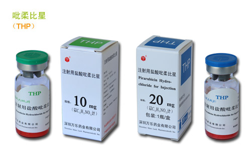 我公司的主导产品注射用盐酸吡柔比星(曾用名:吡喃阿霉素)(英文简字THP)是1979年由日本微生物化学研究所梅泽滨夫(H.Umezawa)教授等人研制开发成功的新一代蒽环类抗肿瘤抗生素,获日本化合物专利,1993年经国家卫生部批准,由我公司从日本美露香株式会社正式引进在国内进行生产、销售,目前在国内为独家品种。经过大量的国内多家权威医疗单位的临床验证及临床观察,证明该药与同类其它蒽环类药物多柔比星及表柔比星相比,对多数肿瘤(实体瘤、血液系统肿瘤)疗效基本相当,包括头颈部肿瘤、乳腺癌、尿路上皮癌、卵巢癌、子宫癌、急性白血病和恶性淋巴瘤,是一个广谱抗肿瘤药物。